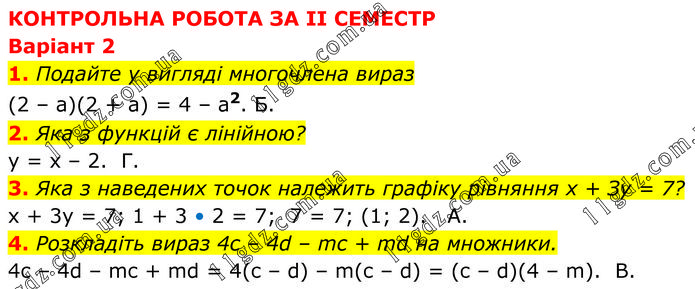 КОНТРОЛЬНА РОБОТА ЗА II СЕМЕСТР Варіант 2 1. Подайте у вигляді многочлена вираз (2 – a)(2 + a) = 4 – a2. Б. 2. Яка з функцій є лінійною? y = x – 2. Г. 3. Яка з наведених точок належить графіку рівняння х + Зу = 7? x + 3y = 7; 1 + 3 • 2 = 7; 7 = 7; (1; 2). A. 4. Розкладіть вираз 4с – 4d – mс + md на множники. 4c – 4d – mc + md = 4(c – d) – m(c – d) = (c – d)(4 – m). B.