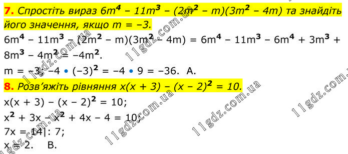 7. Спростіть вираз 6m4 – 11m3 – (2m2 – m)(3m2 – 4m) та знайдіть його значення, якщо m = –3. 6m4 – 11m3 – (2m2 – m)(3m2 – 4m) = 6m4 – 11m3 – 6m4 + 3m3 + 8m3 – 4m2 = –4m2. m = –3; –4 • (–3)2 = –4 • 9 = –36. A. 8. Розв’яжіть рівняння х(х + 3) – (х – 2)2 = 10. x(x + 3) – (x – 2)2 = 10; x2 + 3x – x2 + 4x – 4 = 10; 7x = 14|: 7; x = 2. B.