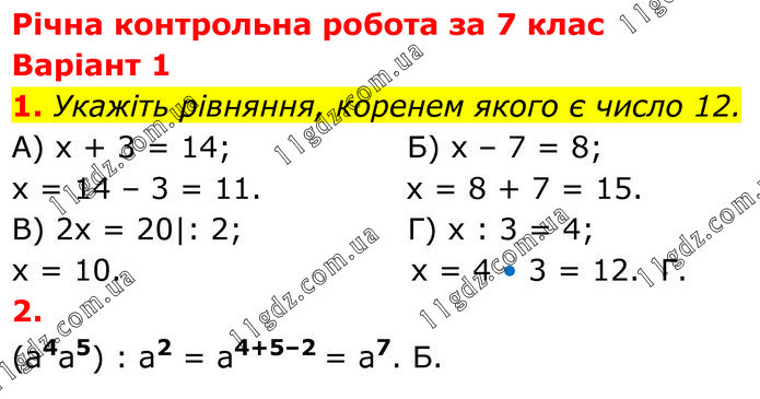 Річна контрольна робота за 7 клас Варіант 1 1. Укажіть рівняння, коренем якого є число 12. A) x + 3 = 14; Б) х – 7 = 8; х = 14 – 3 = 11. х = 8 + 7 = 15. В) 2x = 20|: 2; Г) x : 3 = 4; x = 10. x = 4 • 3 = 12. Г. 2. (a4a5) : a2 = a4+5–2 = a7. Б.