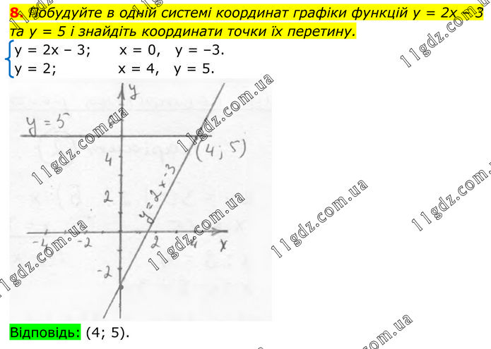 Побудуйте в одній системі координат графіки функцій у = 2х – 3 та у = 5 і знайдіть координати точки їх перетину. y = 2x – 3; x = 0, y = –3. y = 2; x = 4, y = 5. Відповідь: (4; 5).