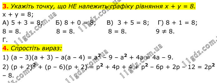 3. Укажіть точку, що НЕ належить графіку рівняння х + у = 8. x + y = 8; А) 5 + 3 = 8; Б) 8 + 0 = 8; В) 3 + 5 = 8; Г) 8 + 1 = 8; 8 = 8. 8 = 8. 8 = 8. 9 ≠ 8. Г. 4. Спростіть вираз: 1) (a – 3)(a + 3) – a(a – 4) = a2 – 9 – a2 + 4a = 4a – 9. 2) (p + 2)2 + (p – 6)(p + 2) = p2 + 4p + 4 + p2 – 6p + 2p – 12 = 2p2 – 8.