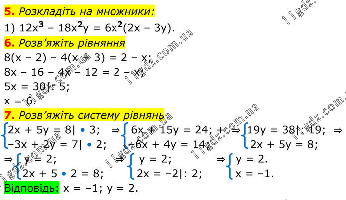 5. Розкладіть на множники: 1) 12x3 – 18x2y = 6x2(2x – 3y). 6. Розв’яжіть рівняння 8(x – 2) – 4(x + 3) = 2 – x; 8x – 16 – 4x – 12 = 2 – x; 5x = 30|: 5; x = 6. 7. Розв’яжіть систему рівнянь