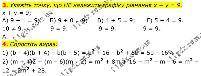 3. Укажіть точку, що НЕ належить графіку рівняння х + у = 9. x + y = 9; А) 9 + 1 = 9; Б) 9 + 0 = 9; В) 4 + 5 = 9; Г) 5 + 4 = 9. 10 ≠ 9. 9 = 9. 9 = 9. 9 = 9. А. 4. Спростіть вираз: 1) (b – 4)(b + 4) – b(b – 5) = b2 + 16 – b2 + 5b = 5b – 16% 2) (m + 4)2 + (m – 6)(m – 2) = m2 + 8m + 16 + m2 – m – 6 = m2 + 12 = 2m2 + 28.