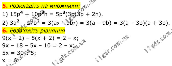 5. Розкладіть на множники: 1) 15p4 + 10p3n = 5p3(3p(3p + 2n). 2) 3a2 – 27b2 = 3(a2 – 9b2) = 3(a – 9b) = 3(a – 3b)(a + 3b). 6. Розв’яжіть рівняння 9(x – 2) – 5(x + 2) = 2 – x; 9x – 18 – 5x – 10 = 2 – x; 5x = 30|: 5; x = 6.