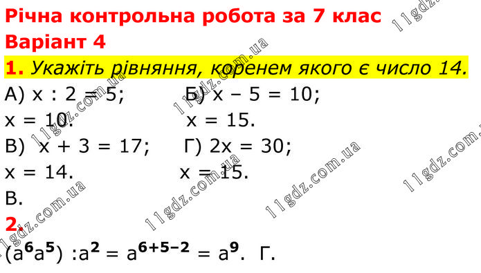 Річна контрольна робота за 7 клас Варіант 4 1. Укажіть рівняння, коренем якого є число 14. А) x : 2 = 5; Б) x – 5 = 10; x = 10. x = 15. В) x + 3 = 17; Г) 2x = 30; x = 14. x = 15. В. 2. (a6a5) :a2 = a6+5–2 = a9. Г.