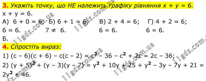 3. Укажіть точку, що НЕ належить графіку рівняння х + у = 6. х + у = 6. А) 6 + 0 = 6; Б) 6 + 1 = 6; В) 2 + 4 = 6; Г) 4 + 2 = 6; 6 = 6. 7 ≠ 6. 6 = 6. 6 = 6. Б. 4. Спростіть вираз: 1) (c – 6)(c + 6) – c(c – 2) = c2 – 36 – c2 + 2c = 2c – 36; 2) (y + 5)2 + (y – 3)(y – 7) = y2 + 10y + 25 + y2 – 3y – 7y + 21 = 2y2 + 46.
