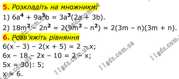 5. Розкладіть на множники: 1) 6a4 + 9a3b = 3a3(2a + 3b). 2) 18m2 – 2n2 = 2(9m2 – n2) = 2(3m – n)(3m + n). 6. Розв’яжіть рівняння 6(x – 3) – 2(x + 5) = 2 – x; 6x – 18 – 2x – 10 = 2 – x; 5x = 30|: 5; x = 6.