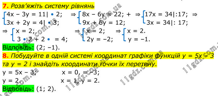 Побудуйте в одній системі координат графіки функцій у = 5х – 3 та у = 2 і знайдіть координати точки їх перетину. y = 5x – 3; x = 0, = –3; y = 2. x = 1, y = 2. Відповідь: (1; 2).