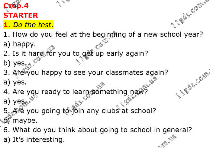 STARTER 1. Do the test. 1. How do you feel at the beginning of a new school year? a) happy. 2. Is it hard for you to get up early again? b) yes. 3. Are you happy to see your classmates again? a) yes. 4. Are you ready to learn something new? a) yes. 5. Are you going to join any clubs at school? c) maybe. 6. What do you think about going to school in general? a) It’s interesting.