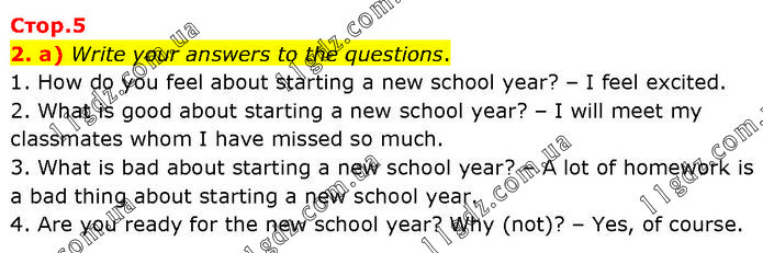 2. a) Write your answers to the questions. 1. How do you feel about starting a new school year? – I feel excited. 2. What is good about starting a new school year? – I will meet my classmates whom I have missed so much. 3. What is bad about starting a new school year? – A lot of homework is a bad thing about starting a new school year. 4. Are you ready for the new school year? Why (not)? – Yes, of course.