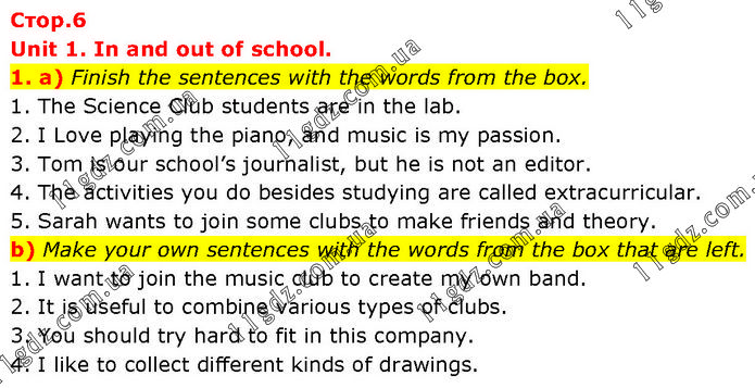 Unit 1. In and out of school. 1. a) Finish the sentences with the words from the box. 1. The Science Club students are in the lab. 2. I Love playing the piano, and music is my passion. 3. Tom is our school’s journalist, but he is not an editor. 4. The activities you do besides studying are called extracurricular. 5. Sarah wants to join some clubs to make friends and theory. b) Make your own sentences with the words from the box that are left. 1. I want to join the music club to create my own band. 2. It is useful to combine various types of clubs. 3. You should try hard to fit in this company. 4. I like to collect different kinds of drawings.