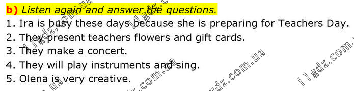 b) Listen again and answer the questions. 1. Ira is busy these days because she is preparing for Teachers Day. 2. They present teachers flowers and gift cards. 3. They make a concert. 4. They will play instruments and sing. 5. Olena is very creative.