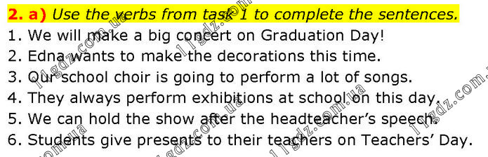 2. a) Use the verbs from task 1 to complete the sentences. 1. We will make a big concert on Graduation Day! 2. Edna wants to make the decorations this time. 3. Our school choir is going to perform a lot of songs. 4. They always perform exhibitions at school on this day. 5. We can hold the show after the headteacher’s speech. 6. Students give presents to their teachers on Teachers’ Day.