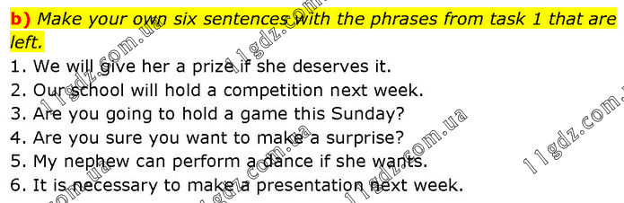 b) Make your own six sentences with the phrases from task 1 that are left. 1. We will give her a prize if she deserves it. 2. Our school will hold a competition next week. 3. Are you going to hold a game this Sunday? 4. Are you sure you want to make a surprise? 5. My nephew can perform a dance if she wants. 6. It is necessary to make a presentation next week.