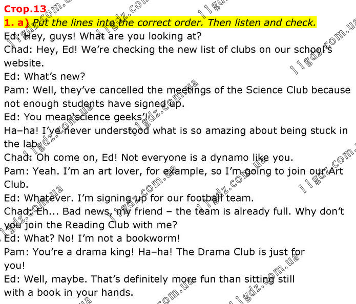Стор.13 1. a) Put the lines into the correct order. Then listen and check. Ed: Hey, guys! What are you looking at? Chad: Hey, Ed! We’re checking the new list of clubs on our school’s website. Ed: What’s new? Pam: Well, they’ve cancelled the meetings of the Science Club because not enough students have signed up. Ed: You mean‘science geeks’! Ha–ha! I’ve never understood what is so amazing about being stuck in the lab. Chad: Oh come on, Ed! Not everyone is a dynamo like you. Pam: Yeah. I’m an art lover, for example, so I’m going to join our Art Club. Ed: Whatever. I’m signing up for our football team. Chad: Eh... Bad news, my friend – the team is already full. Why don’t you join the Reading Club with me? Ed: What? No! I’m not a bookworm! Pam: You’re a drama king! Ha–ha! The Drama Club is just for you! Ed: Well, maybe. That’s definitely more fun than sitting still with a book in your hands.