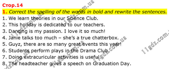 1. Correct the spelling of the words in bold and rewrite the sentences. 1. We learn theories in our Science Club. 2. This holiday is dedicated to our teachers. 3. Dancing is my passion. I love it so much! 4. Janie talks too much – she’s a true chatterbox. 5. Guyz, there are so many great events this year! 6. Students perform plays in the Drama Club. 7. Doing extracuricular activities is useful. 8. The headteacher gives a speech on Graduation Day.