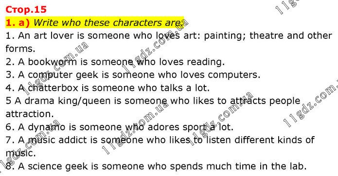 a) Write who these characters are. 1. An art lover is someone who loves art: painting; theatre and other forms. 2. A bookworm is someone who loves reading. 3. A computer geek is someone who loves computers. 4. A chatterbox is someone who talks a lot. 5 A drama king/queen is someone who likes to attracts people attraction. 6. A dynamo is someone who adores sport a lot. 7. A music addict is someone who likes to listen different kinds of music. 8. A science geek is someone who spends much time in the lab.
