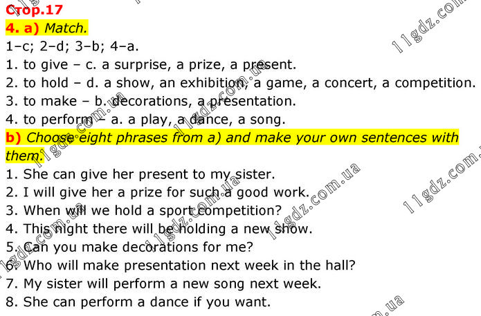 4. a) Match. 1–c; 2–d; 3–b; 4–a. 1. to give – c. a surprise, a prize, a present. 2. to hold – d. a show, an exhibition, a game, a concert, a competition. 3. to make – b. decorations, a presentation. 4. to perform – a. a play, a dance, a song. b) Choose eight phrases from a) and make your own sentences with them. 1. She can give her present to my sister. 2. I will give her a prize for such a good work. 3. When will we hold a sport competition? 4. This night there will be holding a new show. 5. Can you make decorations for me? 6. Who will make presentation next week in the hall? 7. My sister will perform a new song next week. 8. She can perform a dance if you want.