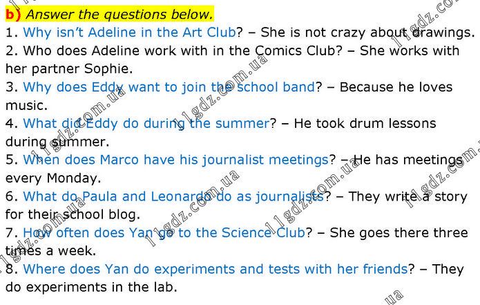 b) Answer the questions below. 1. Why isn’t Adeline in the Art Club? – She is not crazy about drawings. 2. Who does Adeline work with in the Comics Club? – She works with her partner Sophie. 3. Why does Eddy want to join the school band? – Because he loves music. 4. What did Eddy do during the summer? – He took drum lessons during summer. 5. When does Marco have his journalist meetings? – He has meetings every Monday. 6. What do Paula and Leonardo do as journalists? – They write a story for their school blog. 7. How often does Yan go to the Science Club? – She goes there three times a week. 8. Where does Yan do experiments and tests with her friends? – They do experiments in the lab.