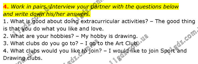 Work in pairs. Interview your partner with the questions below and write down his/her answers. 1. What is good about doing extracurricular activities? – The good thing is that you do what you like and love. 2. What are your hobbies? – My hobby is drawing. 3. What clubs do you go to? – I go to the Art Club. 4. What clubs would you like to join? – I would like to join Sport and Drawing clubs.