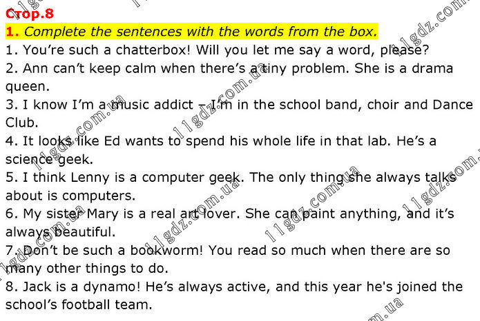 1. Complete the sentences with the words from the box. 1. You’re such a chatterbox! Will you let me say a word, please? 2. Ann can’t keep calm when there’s a tiny problem. She is a drama queen. 3. I know I’m a music addict – I’m in the school band, choir and Dance Club. 4. It looks like Ed wants to spend his whole life in that lab. He’s a science geek. 5. I think Lenny is a computer geek. The only thing she always talks about is computers. 6. My sister Mary is a real art lover. She can paint anything, and it’s always beautiful. 7. Don’t be such a bookworm! You read so much when there are so many other things to do. 8. Jack is a dynamo! He’s always active, and this year he's joined the school’s football team.