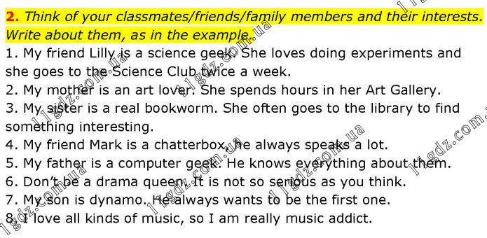 Think of your classmates/friends/family members and their interests. Write about them, as in the example. 1. My friend Lilly is a science geek. She loves doing experiments and she goes to the Science Club twice a week. 2. My mother is an art lover. She spends hours in her Art Gallery. 3. My sister is a real bookworm. She often goes to the library to find something interesting. 4. My friend Mark is a chatterbox, he always speaks a lot. 5. My father is a computer geek. He knows everything about them. 6. Don’t be a drama queen. It is not so serious as you think. 7. My son is dynamo. He always wants to be the first one. 8. I love all kinds of music, so I am really music addict.