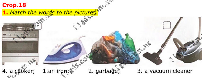1. Match the words to the pictures. 4. a cooker; 1.an iron; 2. garbage; 3. a vacuum cleaner
