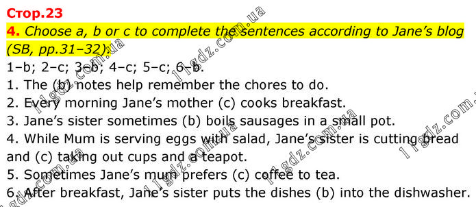 4. Choose a, b or c to complete the sentences according to Jane’s blog (SB, pp.31–32). 1–b; 2–c; 3–b; 4–c; 5–c; 6–b. 1. The (b) notes help remember the chores to do. 2. Every morning Jane’s mother (c) cooks breakfast. 3. Jane’s sister sometimes (b) boils sausages in a small pot. 4. While Mum is serving eggs with salad, Jane’s sister is cutting bread and (c) taking out cups and a teapot. 5. Sometimes Jane’s mum prefers (c) coffee to tea. 6. After breakfast, Jane’s sister puts the dishes (b) into the dishwasher.