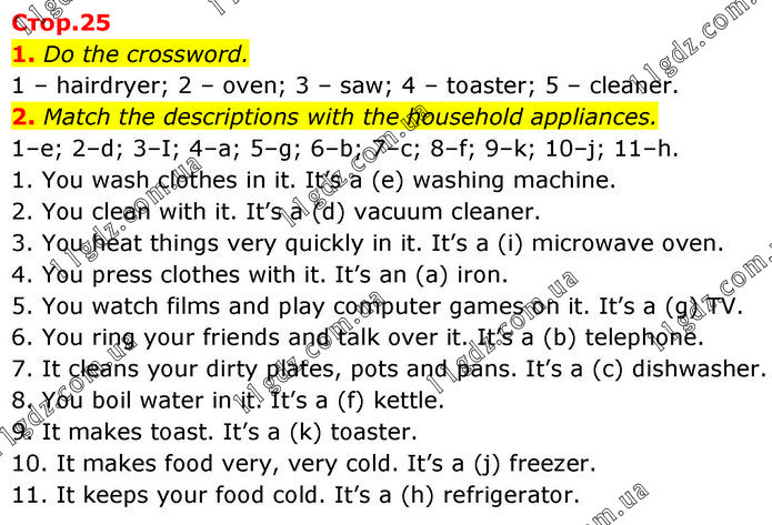 1. Do the crossword. 1 – hairdryer; 2 – oven; 3 – saw; 4 – toaster; 5 – cleaner. 2. Match the descriptions with the household appliances. 1–e; 2–d; 3–I; 4–a; 5–g; 6–b; 7–c; 8–f; 9–k; 10–j; 11–h. 1. You wash clothes in it. It’s a (e) washing machine. 2. You clean with it. It’s a (d) vacuum cleaner. 3. You heat things very quickly in it. It’s a (і) microwave oven. 4. You press clothes with it. It’s an (a) iron. 5. You watch films and play computer games on it. It’s a (g) TV. 6. You ring your friends and talk over it. It’s a (b) telephone. 7. It cleans your dirty plates, pots and pans. It’s a (c) dishwasher. 8. You boil water in it. It’s a (f) kettle. 9. It makes toast. It’s a (k) toaster. 10. It makes food very, very cold. It’s a (j) freezer. 11. It keeps your food cold. It’s a (h) refrigerator.