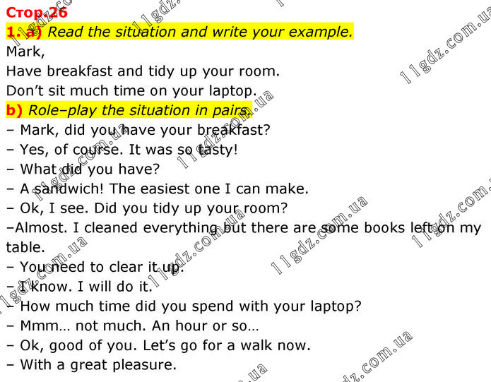 1. a) Read the situation and write your example. Mark, Have breakfast and tidy up your room. Don’t sit much time on your laptop. b) Role–play the situation in pairs. – Mark, did you have your breakfast? – Yes, of course. It was so tasty! – What did you have? – A sandwich! The easiest one I can make. – Ok, I see. Did you tidy up your room? –Almost. I cleaned everything but there are some books left on my table. – You need to clear it up. – I know. I will do it. – How much time did you spend with your laptop? – Mmm… not much. An hour or so… – Ok, good of you. Let’s go for a walk now. – With a great pleasure.