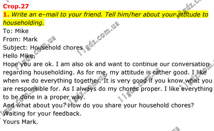1. Write an e–mail to your friend. Tell him/her about your attitude to householding. To: Mike From: Mark Subject: Household chores Hello Mike, Hope you are ok. I am also ok and want to continue our conversation regarding householding. As for me, my attitude is rather good. I like when we do everything together. It is very good if you know what you are responsible for. As I always do my chores proper. I like everything to be done in a proper way. And what about you? How do you share your household chores? Waiting for your feedback. Yours Mark.