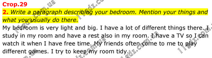 2. Write a paragraph describing your bedroom. Mention your things and what you usually do there. My bedroom is very light and big. I have a lot of different things there. I study in my room and have a rest also in my room. I have a TV so I can watch it when I have free time. My friends often come to me to play different games. I try to keep my room tidy.