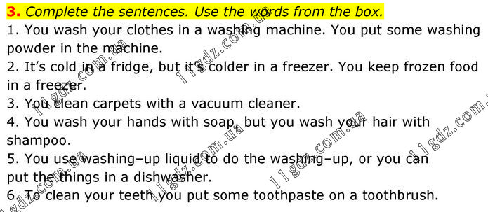 3. Complete the sentences. Use the words from the box. 1. You wash your clothes in a washing machine. You put some washing powder in the machine. 2. It’s cold in a fridge, but it’s colder in a freezer. You keep frozen food in a freezer. 3. You clean carpets with a vacuum cleaner. 4. You wash your hands with soap, but you wash your hair with shampoo. 5. You use washing–up liquid to do the washing–up, or you can put the things in a dishwasher. 6. To clean your teeth you put some toothpaste on a toothbrush.