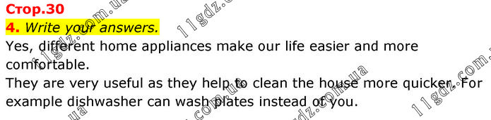4. Write your answers. Yes, different home appliances make our life easier and more comfortable. They are very useful as they help to clean the house more quicker. For example dishwasher can wash plates instead of you.