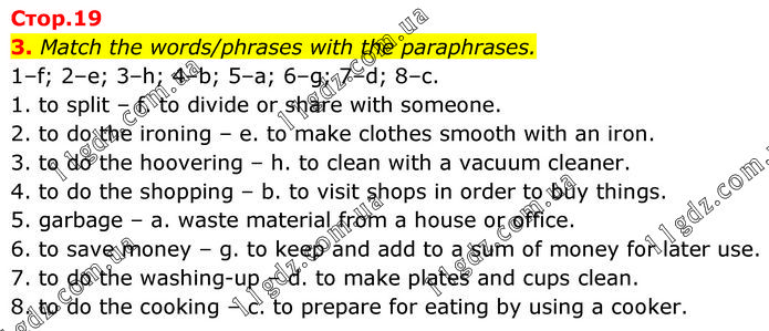 Match the words/phrases with the paraphrases. 1–f; 2–e; 3–h; 4–b; 5–a; 6–g; 7–d; 8–c. 1. to split – f. to divide or share with someone. 2. to do the ironing – e. to make clothes smooth with an iron. 3. to do the hoovering – h. to clean with a vacuum cleaner. 4. to do the shopping – b. to visit shops in order to buy things. 5. garbage – a. waste material from a house or office. 6. to save money – g. to keep and add to a sum of money for later use. 7. to do the washing-up – d. to make plates and cups clean. 8. to do the cooking – c. to prepare for eating by using a cooker.