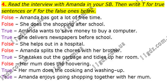 Read the interview with Amanda in your SB. Then write T for true sentences or F for the false ones below. Folse – Amanda has got a lot of free time. Folse – She does the shopping after school. True – Amanda wants to save money to buy a computer. True – She delivers newspapers before school. Folse – She helps out in a hospital. Folse – Amanda splits the chores with her brother. True – She takes out the garbage and tidies up her room. Folse – Her mum does the hoovering. True – Her mum does the cooking and washing–up. True – Amanda enjoys going shopping together with her mum.