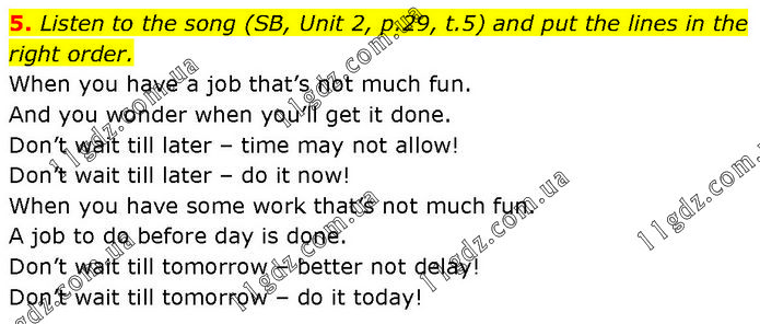 Listen to the song (SB, Unit 2, p.29, t.5) and put the lines in the right order. When you have a job that’s not much fun. And you wonder when you’ll get it done. Don’t wait till later – time may not allow! Don’t wait till later – do it now! When you have some work that’s not much fun. A job to do before day is done. Don’t wait till tomorrow – better not delay! Don’t wait till tomorrow – do it today!