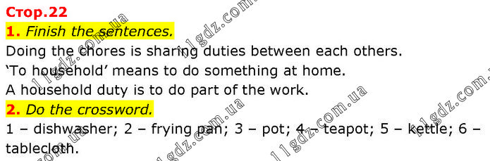1. Finish the sentences. Doing the chores is sharing duties between each others. ‘To household’ means to do something at home. A household duty is to do part of the work. 2. Do the crossword. 1 – dishwasher; 2 – frying pan; 3 – pot; 4 – teapot; 5 – kettle; 6 – tablecloth.