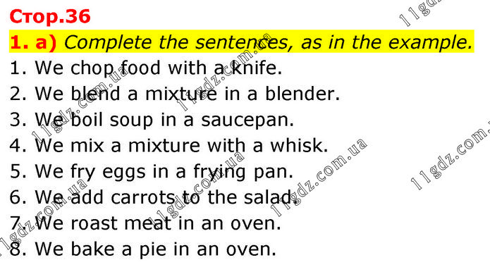 1. a) Complete the sentences, as in the example. 1. We chop food with a knife. 2. We blend a mixture in a blender. 3. We boil soup in a saucepan. 4. We mix a mixture with a whisk. 5. We fry eggs in a frying pan. 6. We add carrots to the salad. 7. We roast meat in an oven. 8. We bake a pie in an oven.