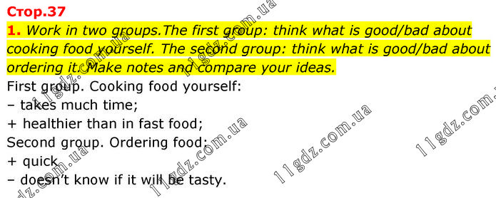 1. Work in two groups.The first group: think what is good/bad about cooking food yourself. The second group: think what is good/bad about ordering it. Make notes and compare your ideas. First group. Cooking food yourself: – takes much time; + healthier than in fast food; Second group. Ordering food: + quick – doesn’t know if it will be tasty.