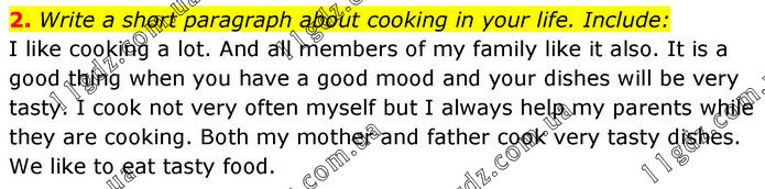 2. Write a short paragraph about cooking in your life. Include: I like cooking a lot. And all members of my family like it also. It is a good thing when you have a good mood and your dishes will be very tasty. I cook not very often myself but I always help my parents while they are cooking. Both my mother and father cook very tasty dishes. We like to eat tasty food.