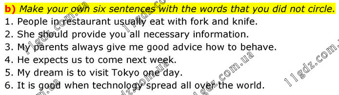 b) Make your own six sentences with the words that you did not circle. 1. People in restaurant usually eat with fork and knife. 2. She should provide you all necessary information. 3. My parents always give me good advice how to behave. 4. He expects us to come next week. 5. My dream is to visit Tokyo one day. 6. It is good when technology spread all over the world.