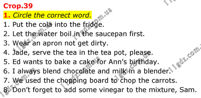 1. Circle the correct word. 1. Put the cola into the fridge. 2. Let the water boil in the saucepan first. 3. Wear an apron not get dirty. 4. Jade, serve the tea in the tea pot, please. 5. Ed wants to bake a cake for Ann’s birthday. 6. I always blend chocolate and milk in a blender. 7. We used the chopping board to chop the carrots. 8. Don’t forget to add some vinegar to the mixture, Sam.