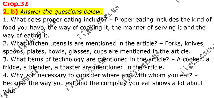 2. b) Answer the questions below. 1. What does proper eating include? – Proper eating includes the kind of food you have, the way of cooking it, the manner of serving it and the way of eating it. 2. What kitchen utensils are mentioned in the article? – Forks, knives, spoons, plates, bowls, glasses, cups are mentioned in the article. 3. What items of technology are mentioned in the article? – A cooker, a fridge, a blender, a toaster are mentioned in the article. 4. Why is it necessary to consider where and with whom you eat? – Because the way you eat and the company you eat shows a lot about you.