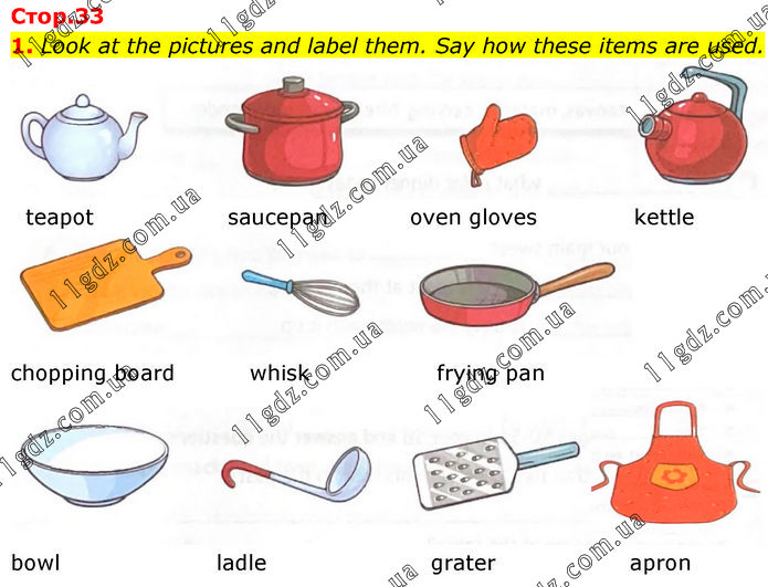 1. Look at the pictures and label them. Say how these items are used. teapot saucepan oven gloves kettle chopping board whisk frying pan bowl ladle grater apron