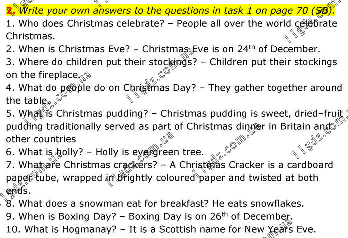2. Write your own answers to the questions in task 1 on page 70 (SB). 1. Who does Christmas celebrate? – People all over the world celebrate Christmas. 2. When is Christmas Eve? – Christmas Eve is on 24th of December. 3. Where do children put their stockings? – Children put their stockings on the fireplace. 4. What do people do on Christmas Day? – They gather together around the table. 5. What is Christmas pudding? – Christmas pudding is sweet, dried–fruit pudding traditionally served as part of Christmas dinner in Britain and other countries 6. What is holly? – Holly is evergreen tree. 7. What are Christmas crackers? – A Christmas Cracker is a cardboard paper tube, wrapped in brightly coloured paper and twisted at both ends. 8. What does a snowman eat for breakfast? He eats snowflakes. 9. When is Boxing Day? – Boxing Day is on 26th of December. 10. What is Hogmanay? – It is a Scottish name for New Years Eve.