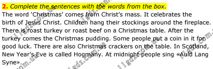 2. Complete the sentences with the words from the box. The word ‘Christmas’ comes from Christ’s mass. It celebrates the birth of Jesus Christ. Children hang their stockings around the fireplace. There is roast turkey or roast beef on a Christmas table. After the turkey comes the Christmas pudding. Some people put a coin in it for good luck. There are also Christmas crackers on the table. In Scotland, New Year’s Eve is called Hogmany. At midnight people sing «Auld Lang Syne».