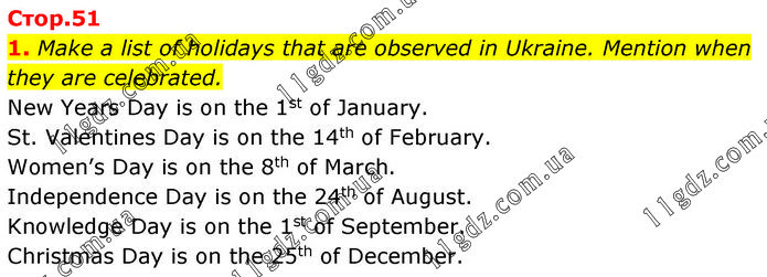 1. Make a list of holidays that are observed in Ukraine. Mention when they are celebrated. New Years Day is on the 1st of January. St. Valentines Day is on the 14th of February. Women’s Day is on the 8th of March. Independence Day is on the 24th of August. Knowledge Day is on the 1st of September. Christmas Day is on the 25th of December.