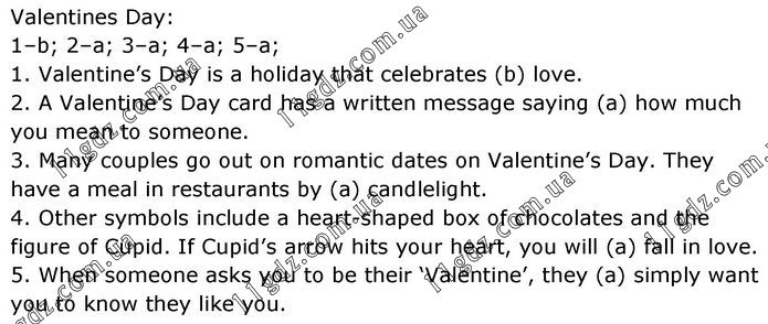Valentines Day: 1–b; 2–a; 3–a; 4–a; 5–a; 1. Valentine’s Day is a holiday that celebrates (b) love. 2. A Valentine’s Day card has a written message saying (a) how much you mean to someone. 3. Many couples go out on romantic dates on Valentine’s Day. They have a meal in restaurants by (a) candlelight. 4. Other symbols include a heart-shaped box of chocolates and the figure of Cupid. If Cupid’s arrow hits your heart, you will (a) fall in love. 5. When someone asks you to be their ‘Valentine’, they (a) simply want you to know they like you.