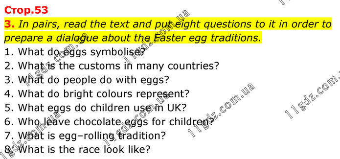 3. In pairs, read the text and put eight questions to it in order to prepare a dialogue about the Easter egg traditions. 1. What do eggs symbolise? 2. What is the customs in many countries? 3. What do people do with eggs? 4. What do bright colours represent? 5. What eggs do children use in UK? 6. Who leave chocolate eggs for children? 7. What is egg–rolling tradition? 8. What is the race look like?